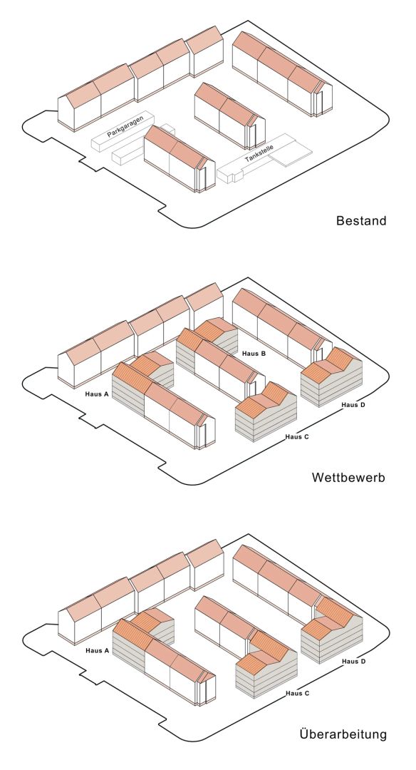 Und nach dieser Entscheidung? Jedenfalls kein Ende der von uns geforderten konzeptionellen Überarbeitungen. Neben den vielen Optimierungen der Wohnungsgrundrisse und erfolgreicher Prüfung auf Entfall eines kostspieligen Kellers prüften wir noch die Anregung aus dem Wettbewerb, ursprünglich vorgesehene Abstände zu den Neubauten auf dem Tankstellengrundstück kurzerhand baulich aufzufüllen. Dadurch wurde es möglich, ohne Wohnflächenverlust auf ein im Zuge der Nachverdichtung vorgeschlagenes Gebäude ganz zu verzichten, da die Abstände zu den bestehenden Gebäuden recht gering gewesen wären. So konnten wir die Wohnqualität im Bestand sichern und gleichzeitig größere Wirtschaftlichkeit durch bessere Auslastung der geplanten Treppenhäuser und Aufzüge bei den Neubauten erreichen. Was will man mehr?