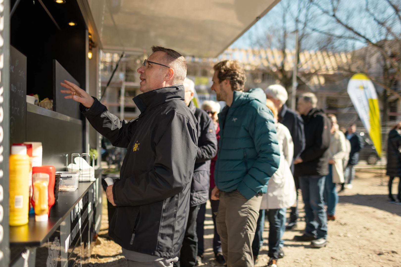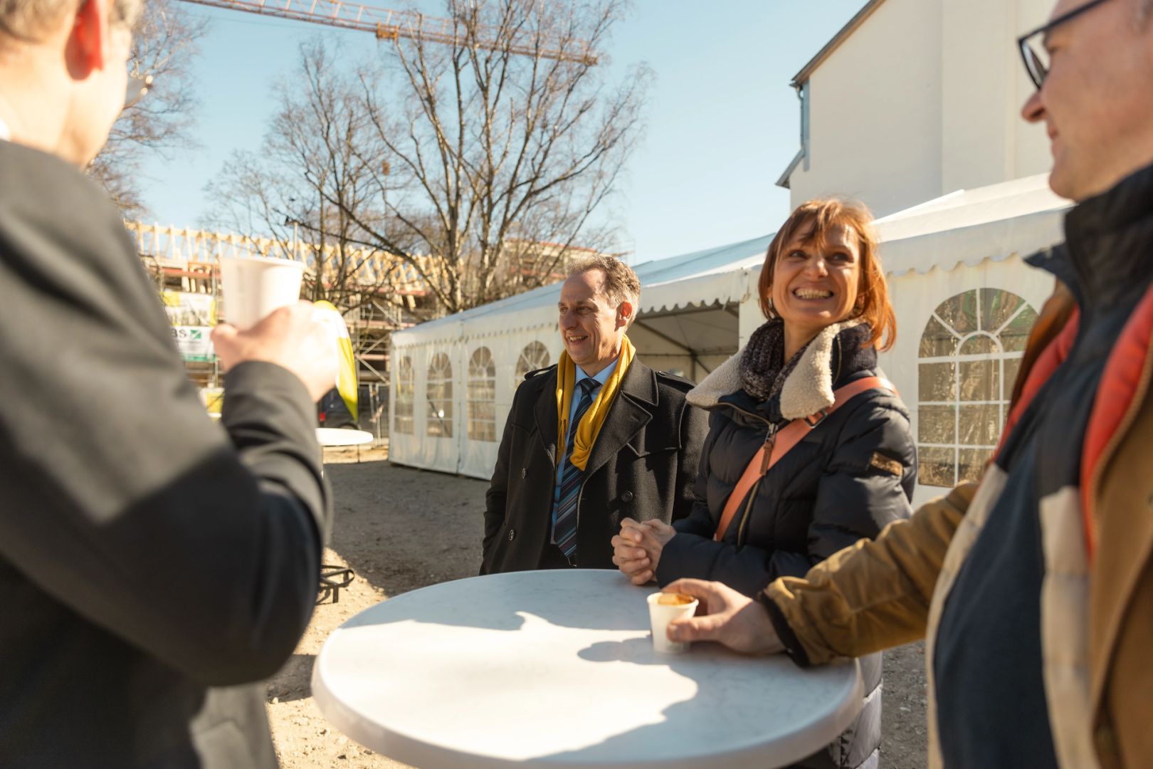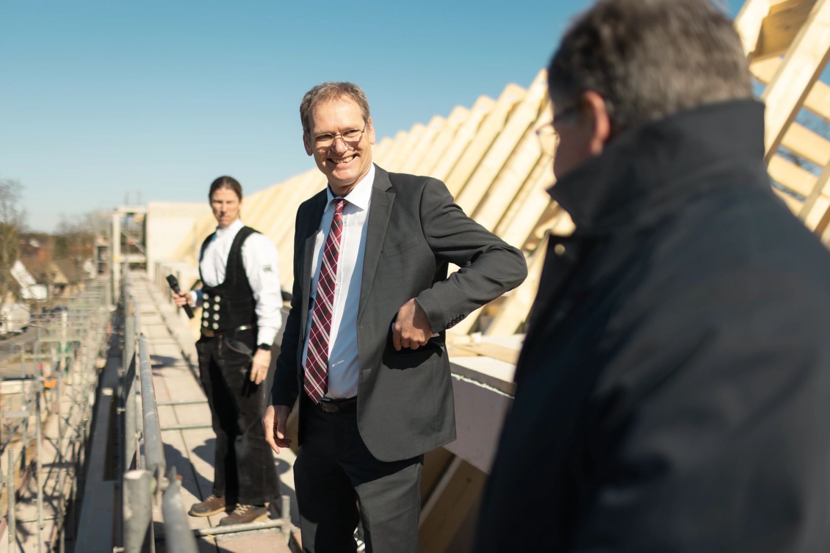 Für die feierliche Rede beim Richtfest stieg spar+bau-Vorstand Rainer Detjen auf das Gerüst des Rohbaus und bedankte sich herzlich bei allen Beteiligten. Detjen lobte den reibungslosen Baufortschritt und den gelungenen Entwurf: „Grundlegende Idee des Gebäudes ist die Laubengangerschließung, sodass dort Kommunikationsflächen entstehen. Denn das ist es ja, was eine Genossenschaft ausmacht: das Gemeinsame, das Miteinander, das Zueinanderfinden.“