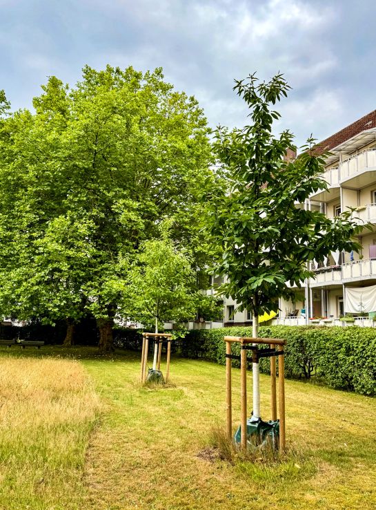 Die behördliche Auflage verlangte nur einen Ersatzbaum. Der Vorstand von spar+bau ging einen Schritt weiter: Im Frühjahr 2024 wurden zwei Edelkastanien (Castanea sativa) gepflanzt – deutlich größer als gefordert. Mit einem Stammumfang von 20–25 Zentimetern und einer Höhe von 4–5 Metern sollen sie nicht nur schnell wachsen, sondern auch langfristig zum Erhalt des parkähnlichen Eindrucks beitragen.